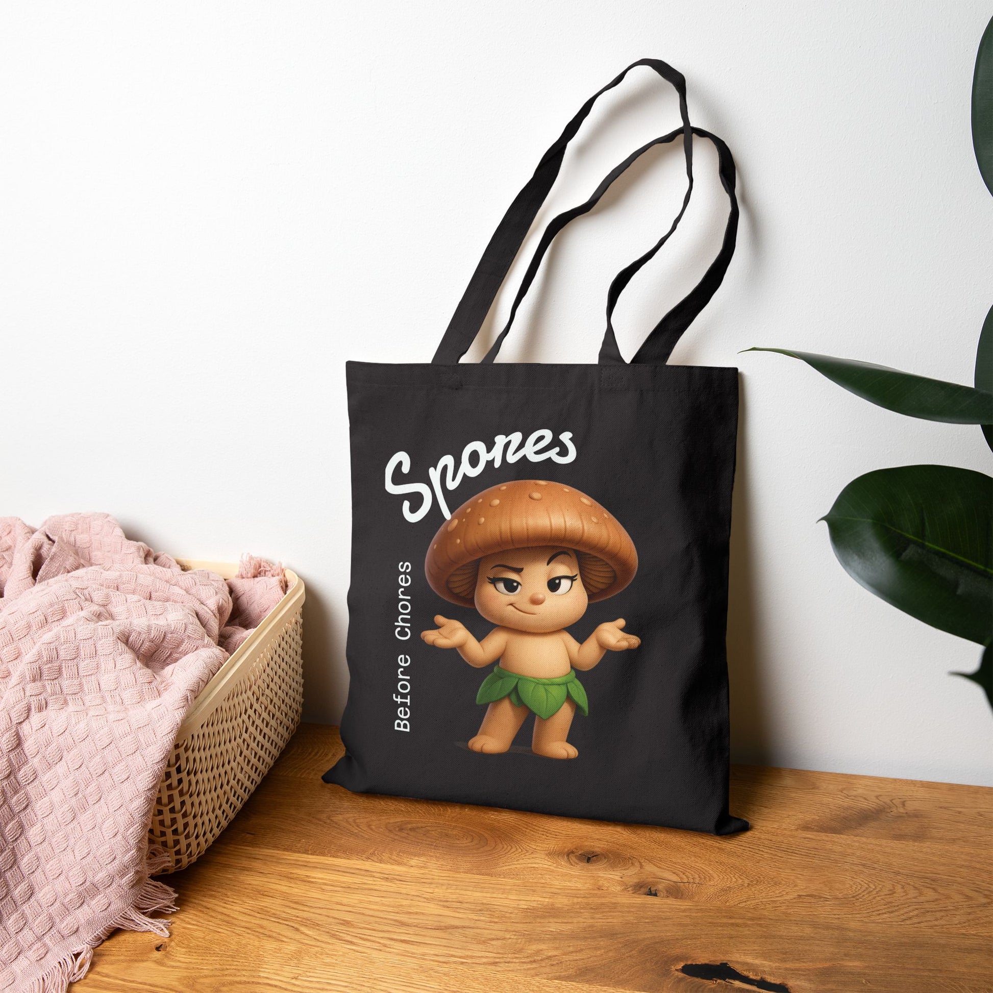 Black Mushroom Sprout Tote Bag — 'Spores' Cute Cartoon Canvas Shopper